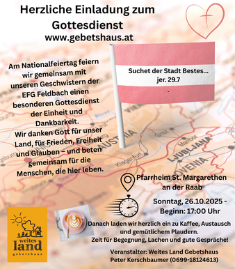 Das Weites Land Gebetshaus ist ein Ort, an dem Menschen im Lebensraum der Oststeiermark in die Gegenwart Gottes eintreten können. Unser Ziel ist es, mitten auf dem Land Menschen für Jesus zu begeistern und sie einzuladen, Gott in seiner unendlichen Liebe zu begegnen. Hier können sie in der Kraft des Heiligen Geistes ihre persönliche Berufung entdecken und entfalten.